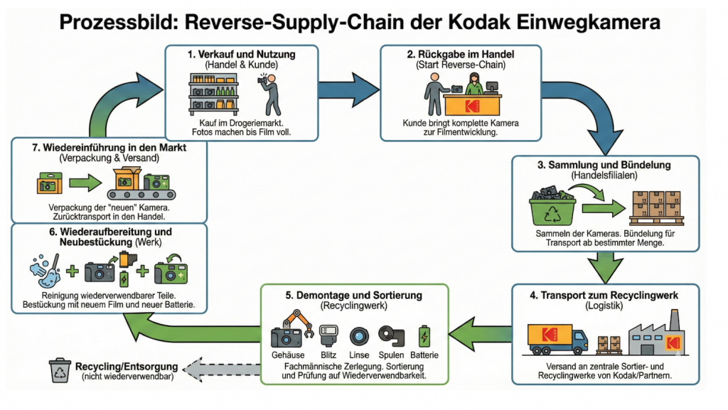 Ein bemerkenswertes Beispiel für ein solches Modell, das bereits vor Jahrzehnten seinen Anfang nahm und heute eine erstaunliche Relevanz beweist, ist die KODAK Einwegkamera. Was viele als Relikt aus vordigitalen Zeiten ansehen, ist bei genauerem Hinsehen ein Paradebeispiel für eine funktionierende und nach wie vor praktizierte Kreislaufwirtschaft. Das Prinzip ist so einfach wie genial: Die Kameras werden nach dem Gebrauch nicht einfach entsorgt, sondern in Fotogeschäften und Drogeriemärkten abgegeben, um die Bilder entwickeln zu lassen. Von dort aus treten sie ihre Reise zurück zum Hersteller an. Große Hersteller wie Kodak nehmen die gebrauchten Kameras zurück, um sie einem Recyclingprozess zuzuführen. In spezialisierten Werken werden die Kameras systematisch demontiert, die einzelnen Bauteile gereinigt und geprüft. Nahezu jeder Bestandteil wird entweder wiederverwertet oder für die Produktion neuer Kameras verwendet. Dieses Modell der „Re-Supply Chain“ war nicht nur ökonomisch äußerst erfolgreich, sondern beweist, dass Nachhaltigkeit und ein profitables Geschäft Hand in Hand gehen können. Während der Vormarsch der digitalen Fotografie das Modell stark herausforderte, hat es nie an Relevanz verloren und erlebt heute im Zuge von Retro-Trends und einem neuen Bewusstsein für Nachhaltigkeit eine Renaissance. Die Nachfrage nach Einwegkameras ist im digitalen Zeitalter weiterhin vorhanden, und das etablierte Recyclingsystem sorgt dafür, dass diese Nachfrage auf eine umweltfreundliche Weise erfüllt wird. Für heutige KMU bietet dieses Beispiel eine wertvolle Inspiration, über eigene, innovative Rücknahmesysteme und langlebige Produktlebenszyklen nachzudenken, die sowohl ökologisch als auch ökonomisch überzeugen.