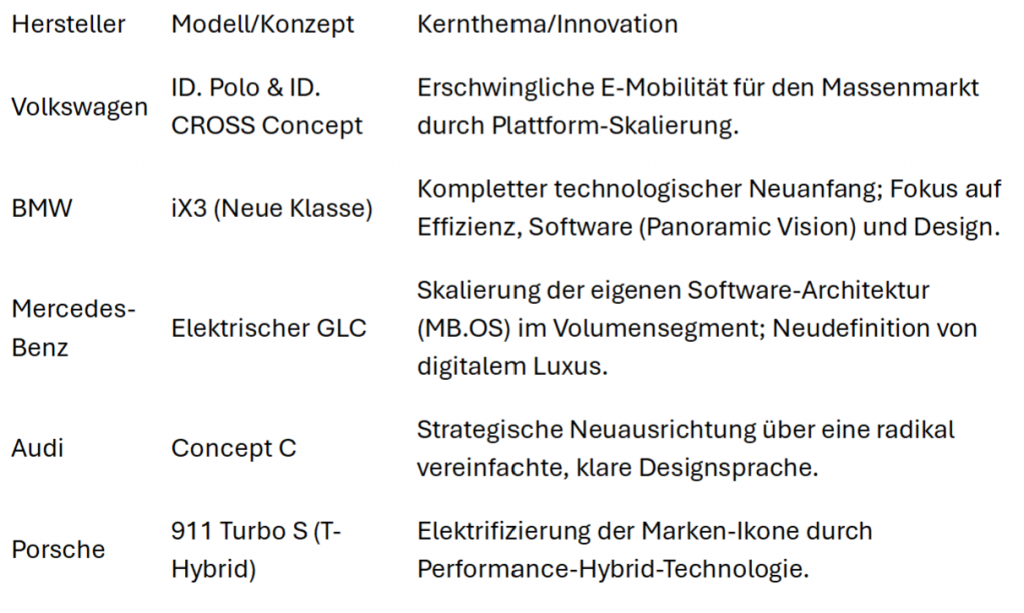 · Audi & Porsche: Audi präsentierte mit dem Concept C eine neue, radikal vereinfachte Designphilosophie der „Klarheit“. Porsche schlug mit dem neuen 911 Turbo S und seiner T-Hybrid-Technologie eine Brücke zwischen der Performance-Tradition und einer elektrifizierten Zukunft.